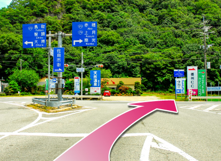 佐用IC出口を右折。 約2㎞先、「上町」交差点で右折します。